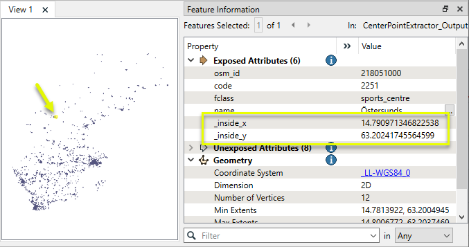As the features exit the CenterPointExtractor, they have two new attributes containing their extracted coordinates.