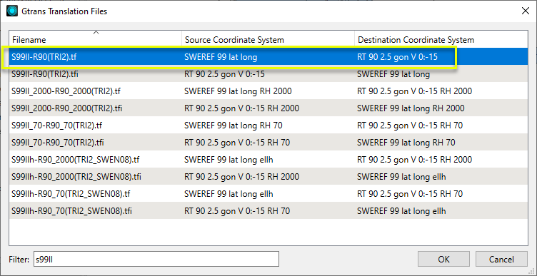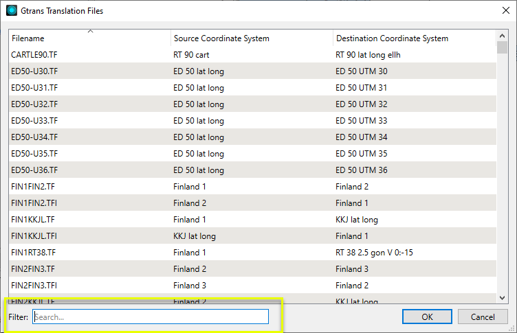 Note that when using the Filter option, FME searches the file names of the *.tf/*.tfi files - not the Source and Destination Coordinate Systems.