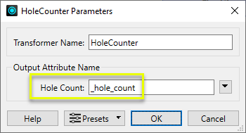 In the parameters dialog, the default name is kept for the Hole Count attribute.