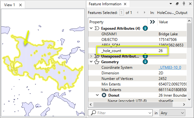 Retrieves the number of holes in donut polygons, storing the result as an attribute.