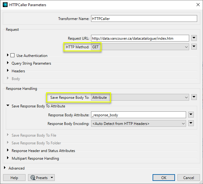 In this portion of a workspace, an HTTPCaller uses the GET method to retrieve the contents of a web page and store them in the attribute _response_body.