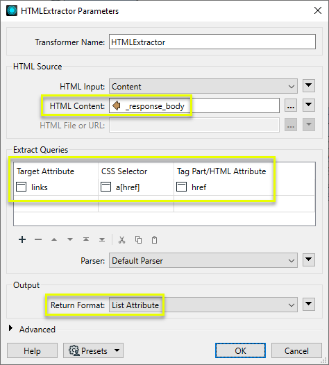 The HTMLExtractor lets you define multiple queries to run against incoming HTML content, which can be provided either as an attribute or as a file. The queries are composed of an output attribute name, a CSS Selector which defines what type of tags to extract, and the choice of extracting whole tags, values, text, or HTML attributes.