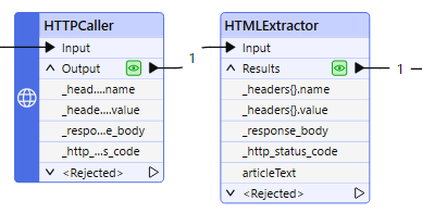 In the HTMLExtractor, a query is constructed to find the div tag with the id “article” (CSS Selector = #article). The contents of that tag will be extracted (Tag Part/HTML Attribute = Value), and output to the new attribute articleText.