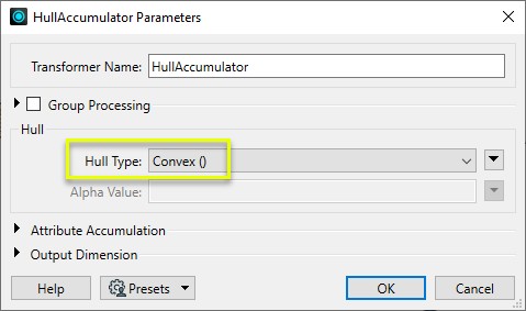 The HullAccumulator receives features with geometry and calculates either a Convex or Concave hull around them.