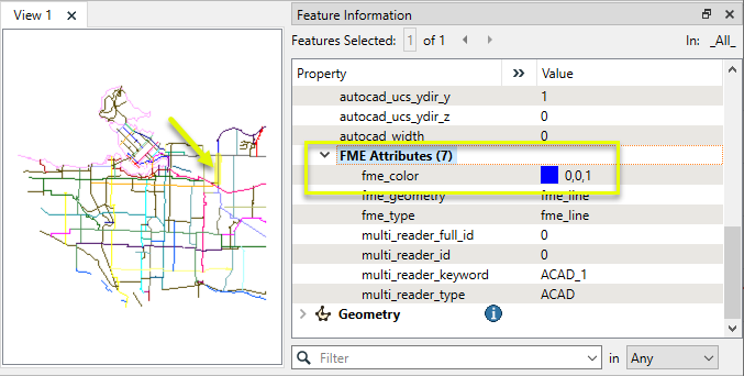 In this example, we will create a raster representation of a DWG file containing bike path lines. As the CAD file has a color attribute already associated with each line, FME assigns that color to the fme_color attribute on reading. (Other formats may need to have colors assigned in the workspace - consider using the FeatureColorSetter).