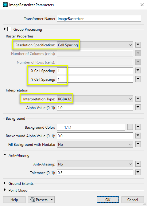 In the parameters dialog, we set the output raster size to be calculated at 1 cell (pixel) per meter (ground units), both vertically and horizontally. The Interpretation Type is RGBA32, and the default settings producing a white background, and anti-aliasing turned off.
