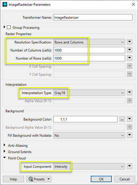 In the parameters dialog, we specify the size of the output raster - this time, defining the output dimensions in overall height and width of 1000 by 1000 cells (pixels). Interpretation Type is set to Gray16, and the Point Cloud Input Component is Intensity.