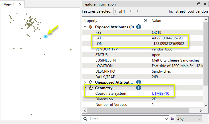 Note that although the dataset is in a UTM coordinate system with ground units in meters, it also has a set of coordinates, latitude and longitude, stored as attributes.