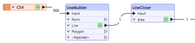 The LineCloser receives linear features and connects their end points to their start points, creating closed polygons. An additional vertex is added at the position of the start point.