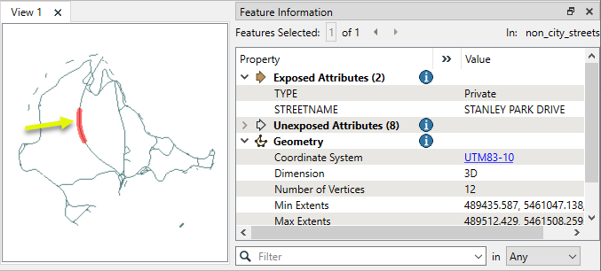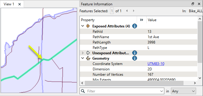 In this example, we perform an overlay of bike path lines on neighborhood polygons. The source data looks like this, where the highlighted line is a bike path line feature that crosses from one neighborhood to another.