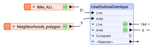 In the workspace, the bike paths are connected to the Line input port, and the neighborhoods are connected to the Area input port.