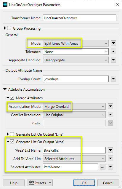 - (Optional) Generate List On Output ‘Area’: This creates a list attribute on the output areas. By choosing Selected Attributes, and then PathName, only the bike path names will be added.