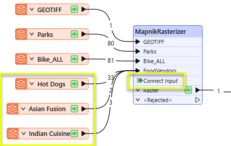 All source datasets are routed into a MapnikRasterizer. creating new input ports when required by connecting to the Connect Input port. Note that all three of the food vendor datasets are connected to the same port - they are all point geometry, and will all be styled the same way.