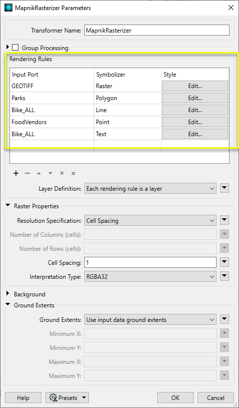 The parameters dialog contains a table of Rendering Rules. Each Rule is composed of an Input Port, a Symbolizer, and Style. Multiple Rules may be created for one input port - for example, a Boundaries layer might be entered three times - once to style the lines, again to add a glow behind them, and again to create and style labels from an attribute.