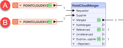 Both point clouds are routed into a PointCloudMerger. The first (A) is the Requestor, and the second (B) is the Supplier. Any components on B will be merged onto A.