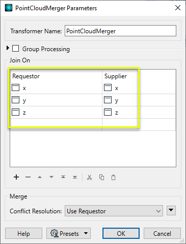 - When merging based on x, y, and z components, the values must match exactly. A PointCloudExpressionEvaluator may be used to round the values and ensure matching.