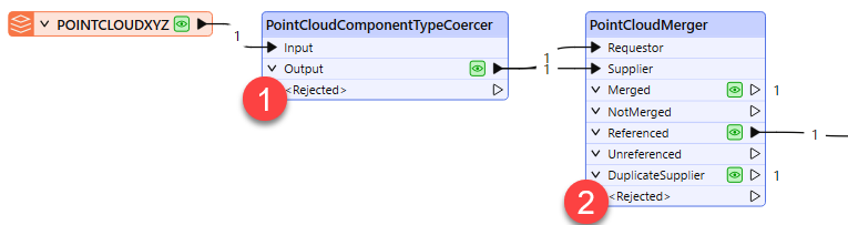 The point cloud is now routed into the PointCloudMerger as both the Supplier and the Requestor - effectively merging it with itself.