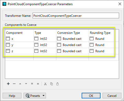 In the parameters dialog of the PointCloudComponentTypeCoercer, the x, y, and z components are converted to type Int32 (32-bit integer), and rounded.