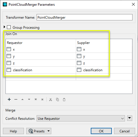 If Group By attributes are selected, features with the same values in the Group By attributes are grouped together, and point clouds will only be merged with other point clouds in the same group. |