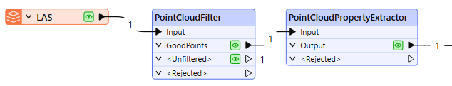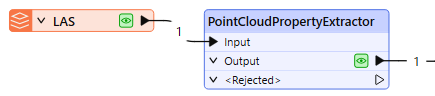 The PointCloudPropertyExtractor receives point cloud features and extracts basic information about their geometry. The results are added as attributes, and output with the original feature.