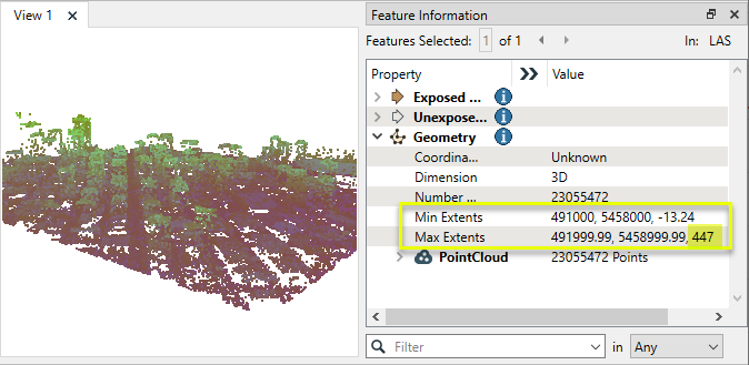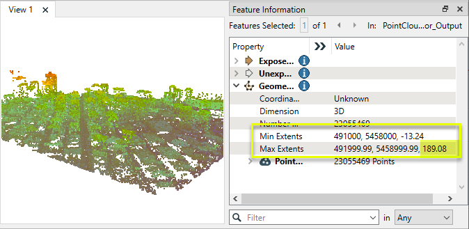 Extracts the geometry properties of a point cloud feature and exposes them as attributes, optionally checking for their existence, retrieving component properties, and finding minimum and maximum values. Extents may also be recalculated and updated.