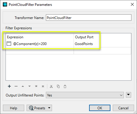 In the PointCloudFilter parameters dialog, one expression is created, sending all points with a z value of less than 200 to the GoodPoints output port.