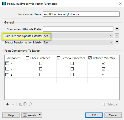 In the PointCloudPropertyExtractor parameters dialog, Calculate and Update Extents is set to Yes.