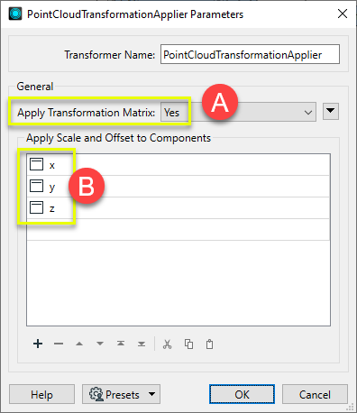 Whether to apply a transformation matrix. If Yes, the resulting point cloud will have x, y, and z components that are of type Real64, with no scale or offset, and no transformation matrix. |