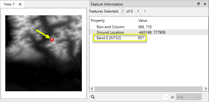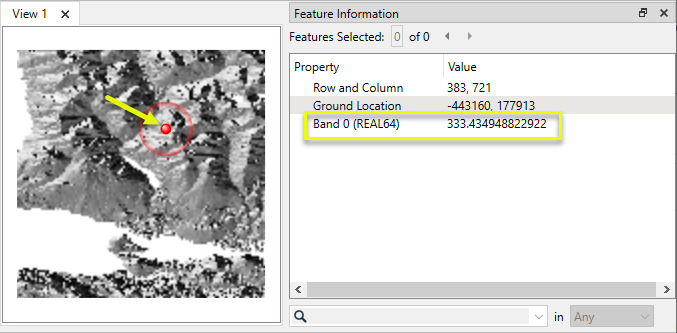 The output raster feature has new Band 0 values - the calculated aspect - and the band has been converted to a floating-point decimal interpretation type (real64).