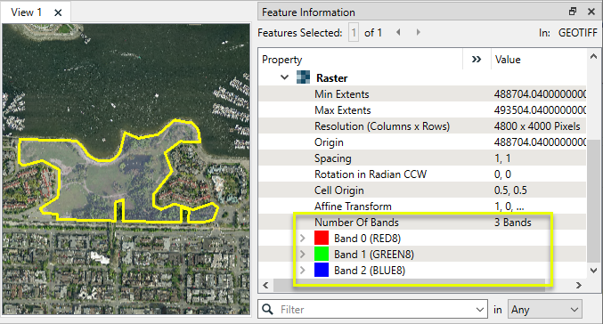 Extracts the band and palette properties of a raster feature and exposes them as attributes. |