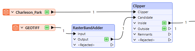 The park polygon is routed into the Clipper input port of a Clipper transformer. The orthoimage is routed first into a RasterBandAdder, and then on to the Clipper’s Clippee input port.