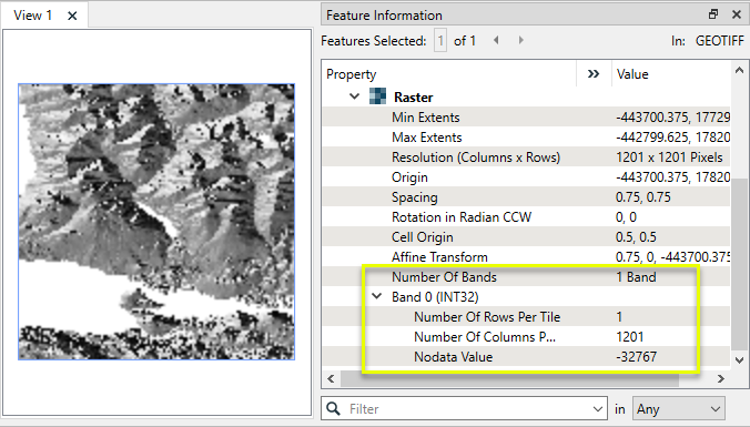 The elevation raster has one band, with the interpretation type INT32 (32-bit integer). The individual cell values in this raster represent elevation in meters.