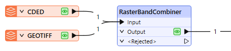 The RasterBandCombiner receives groups of raster features with one or more bands, and appends all bands to a single output raster feature.