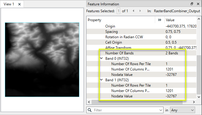 One raster feature is output, with two bands containing the original values from both input features. Note that the raster feature (as viewed in the FME Data Inspector) appears the same as the elevation input raster feature, as it arrived first in the transformer.