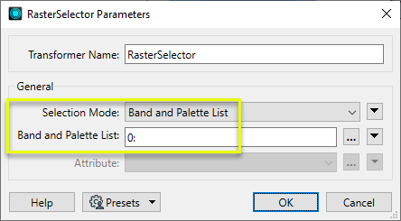 Selects specific bands and palettes of a raster for subsequent transformer operations. |