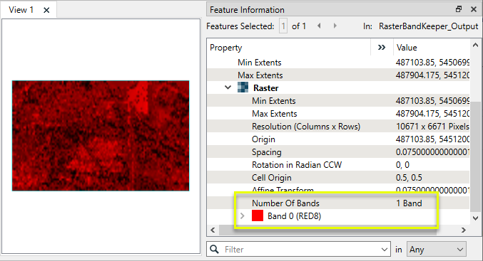The output raster feature contains only one band - Band 0, Red.