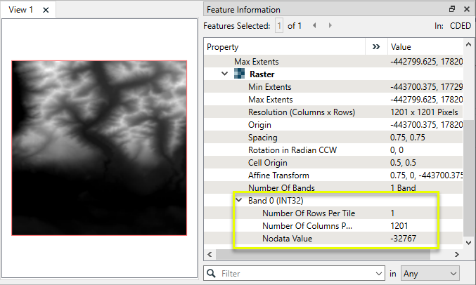 In this example, we will add a band name to a DEM raster. Note that the original raster feature has a single band, with no band name.