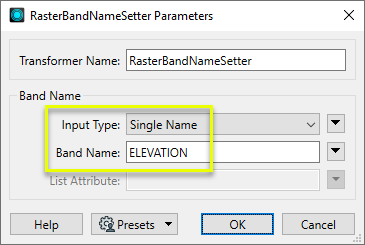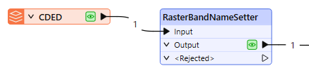 The raster is routed into a RasterBandNameSetter. The default state of the raster is “all bands selected,” so this raster’s single band is currently selected and will be acted on by the transformer.