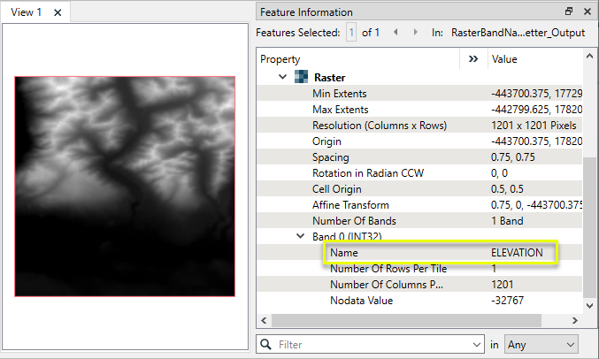 The output raster feature now has a band name, ELEVATION.