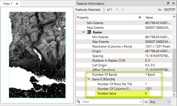 The output raster no longer has a Nodata Value band property. Any cells that had the original Nodata value - zero (0) - still have that value, but they are now considered valid and are displayed.