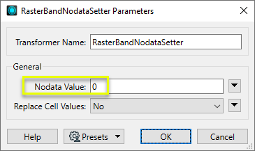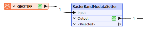 The RasterBandNodataSetter receives raster features, and adds or changes the Nodata property on any selected bands. If a band already has a Nodata value, cells with that value may optionally be changed to the new provided value.