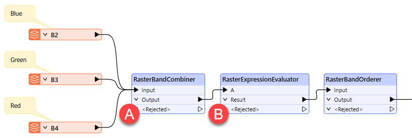 After reading the three bands, the individual single-band raster features are combined with a RasterBandCombiner (A), and then brightened* (as they are very dark) with a RasterExpressionEvaluator (B).