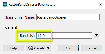 The desired order is Red, Green, Blue, and so the raster feature is routed into a RasterBandOrderer. In the parameters dialog, the desired output order is indicated by the input band index numbers, separated by spaces.