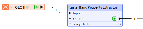 The RasterBandPropertyExtractor receives raster features, and extracts any existing band and palette properties. The results are added to a new list attribute (because a raster may have multiple bands), and output with the original feature.