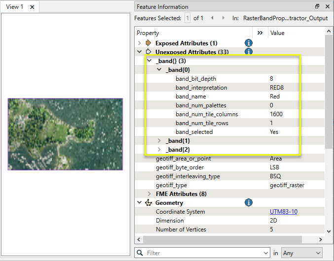In this example, we will extract the band properties on an RGB orthoimage. Note that the source raster feature has a number of attributes, and 3 bands.