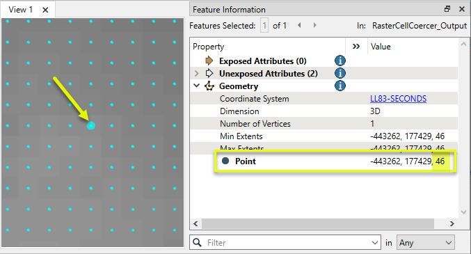 One point is output at the center of every cell, shown here with the original DEM displayed behind the point data. Note that the geometry is 3D, and the selected point has an elevation (z coordinate) of 46.
