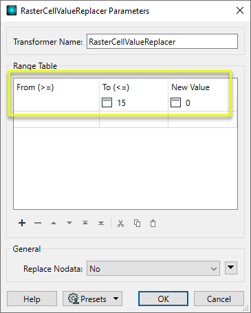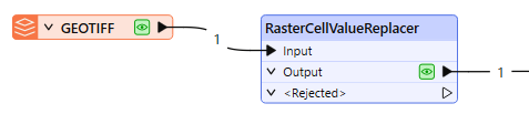 The RasterCellValueReplacer receives raster features. Each band value of each cell is compared to a defined set of numeric ranges, and values that match a range definition are replaced with a new, single defined value.
