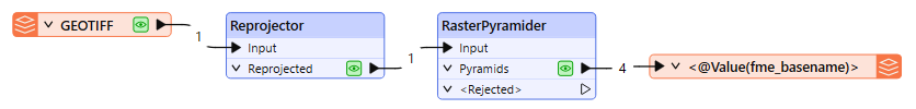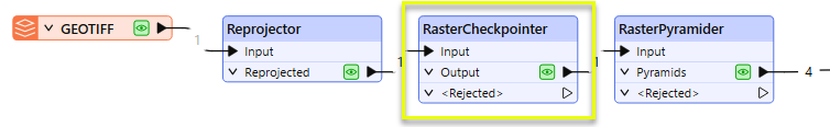 In this scenario, the reprojection operation takes place in the RasterCheckpointer, is written to disk, and then the pyramiding takes place in the GeoTIFF writer.