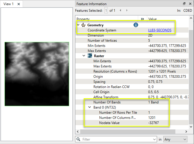 Note that elevation is stored in Band 0, as 32-bit integer, and that it does have a Nodata Value set.