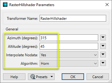 In the parameters dialog, we will keep the default settings. They include the light source’s Azimuth of 315 degrees and Altitude of 45 degrees, which are commonly used values. Interpolate Nodata is set to Yes, and the Algorithm is Horn.